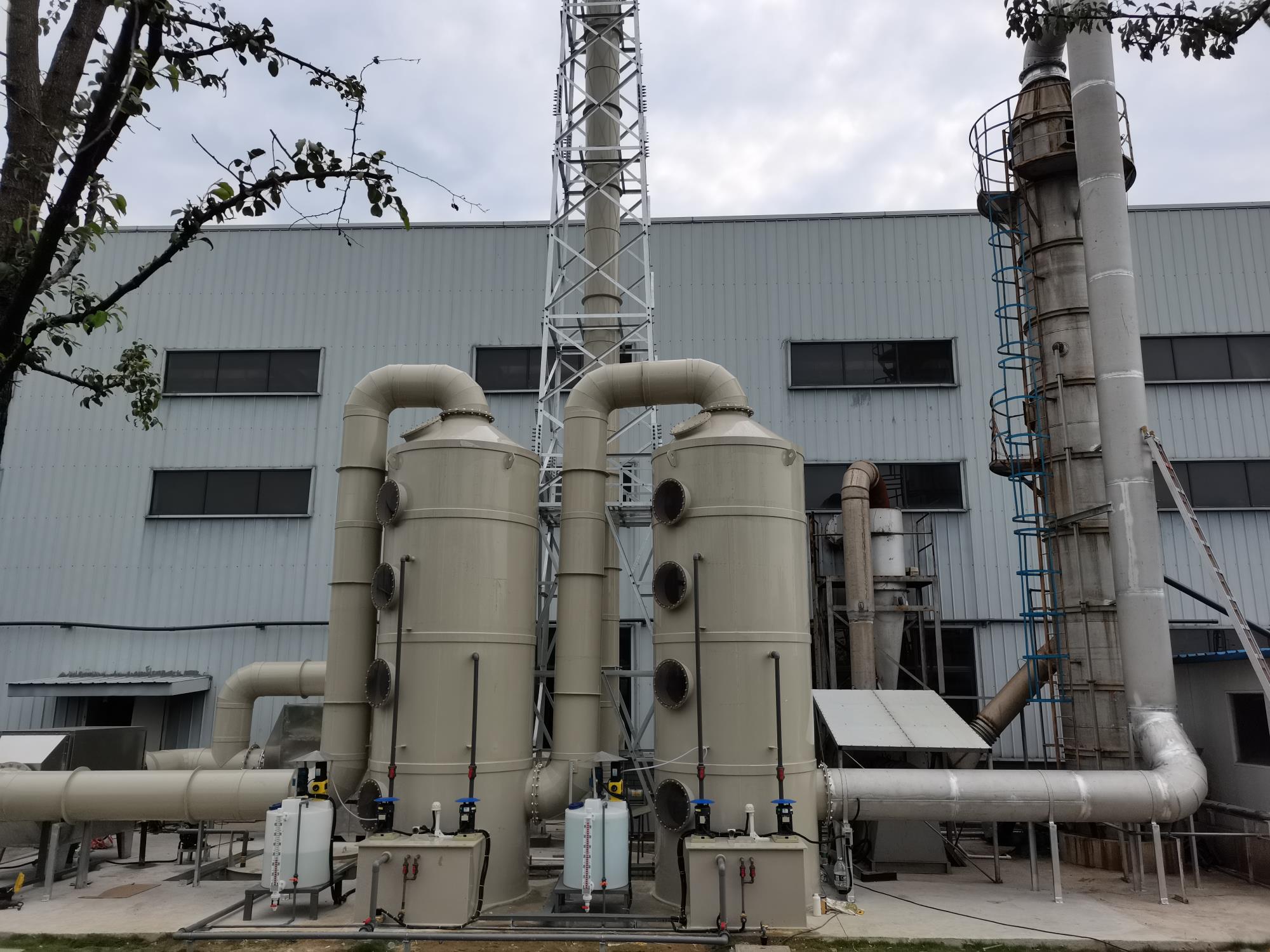 HBT-PP增強PP圓形噴淋塔(洗滌塔)主體采用增強PP材質,設備自重輕,占地面積小,其利用旋流式液體吸收法,適合連續(xù)間歇性排放的廢氣治理,尤其對含粉塵氣體、膠粘性氣體的處理非常有效。廢氣由塔底進入塔體,自下而上穿過填料層,與噴淋而下的吸收液充分接觸、反應,最終達到廢氣凈化目的。